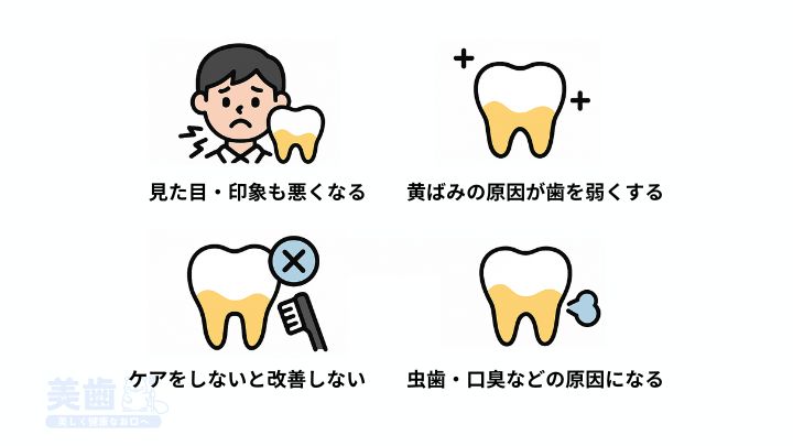 ここでは、歯の黄ばみを放置しない方がよい理由を具体的に解説していきます。