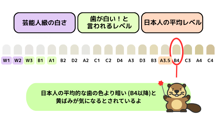 これは、多くの日本人にとって歯が黄色いと感じられるレベルであり、白い歯とは認識されにくい色味なんだ。