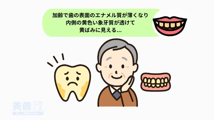 歯の黄ばみの原因の一つに、加齢による変化が挙げられます。