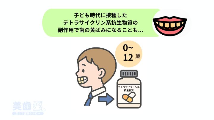テトラサイクリン系の抗生物質を歯が形成される時期(特に0歳から12歳頃まで)に多量に服用すると、副作用として歯の黄ばみや変色が起こることがあります。