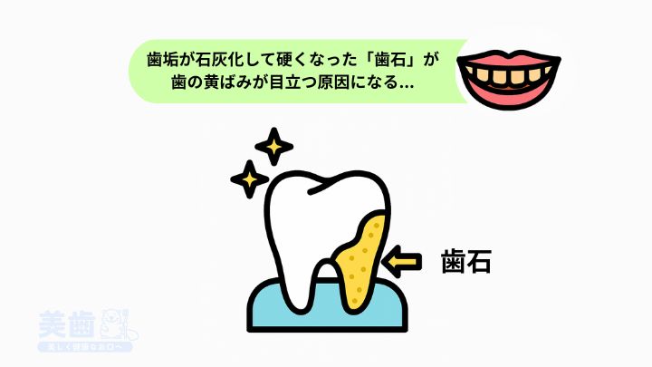 歯石が歯に付着すると、歯の黄ばみの原因となることがあります。
